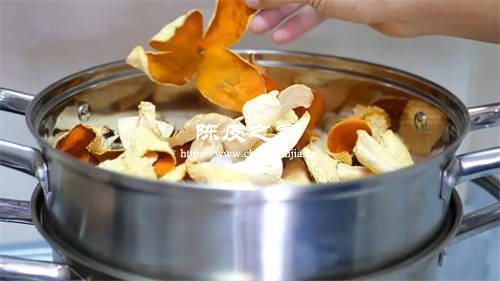 2.將陳皮放置在蒸鍋中,加入適量的清水,蒸制30-40分鐘。