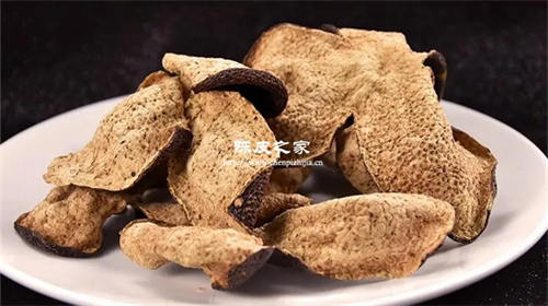 5年陳皮呈鮮紅或者暗紅色,內表皮雪白或者黃白;十年陳皮外表紋路明顯,呈棕褐色或者黑色,內囊有脫落現象。