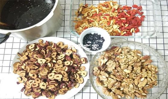 1.準備食材:阿膠250克、黃酒500毫升、黑芝麻250克、核桃仁250克、紅棗200克、黃冰糖250克、枸杞100克、陳皮50克。