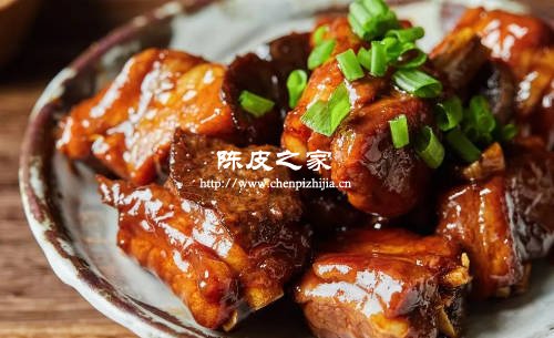 材料:排骨 500 克,陳皮 20 克,姜、蔥、蒜適量,料酒、生抽、老抽、冰糖、鹽、食用油各適量。